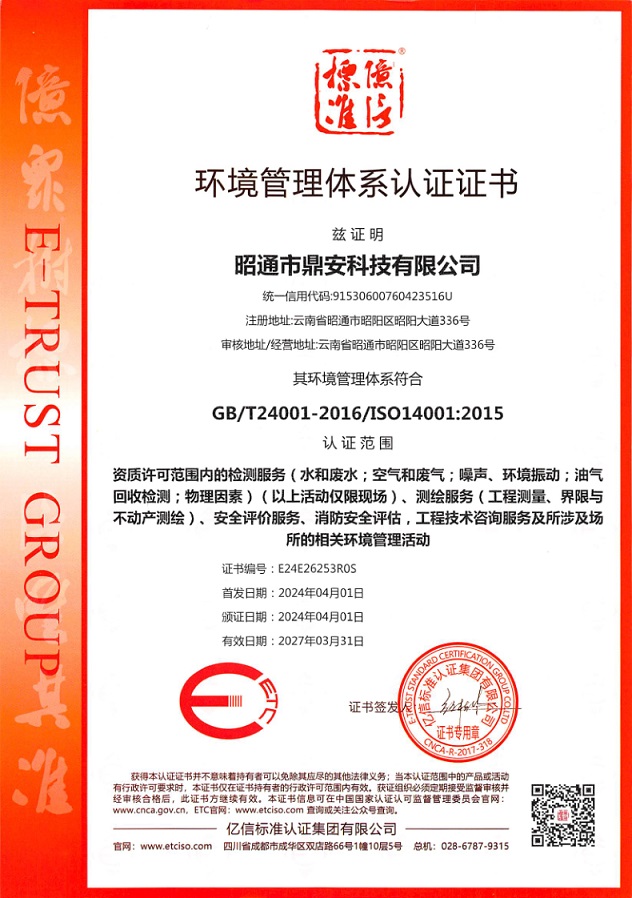 環(huán)境管理體系認證證書